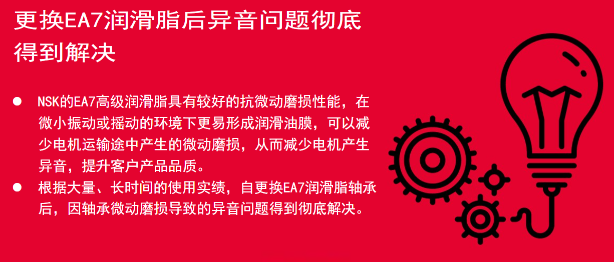 - 相比原产品,EA7润滑脂轴承在微小振动或摇动的环境下更易形成润滑油膜。